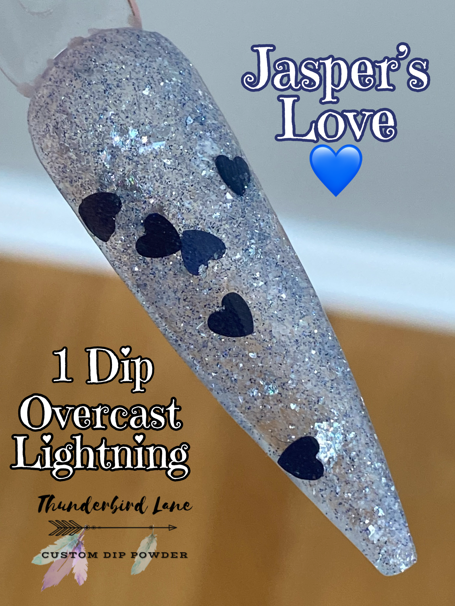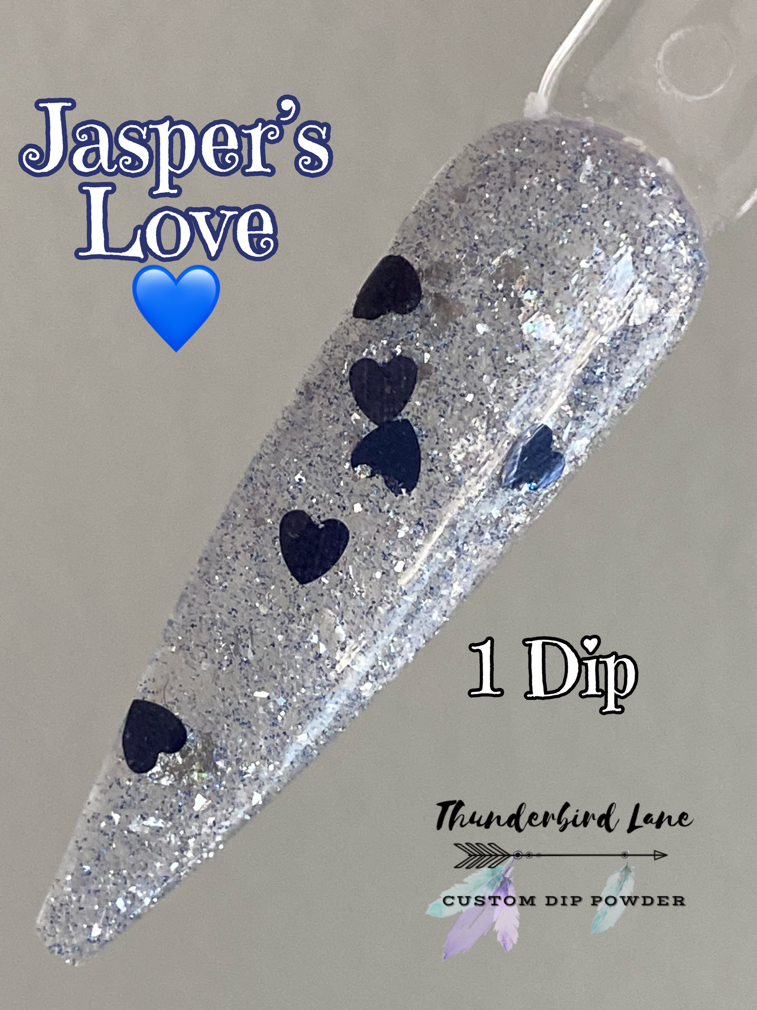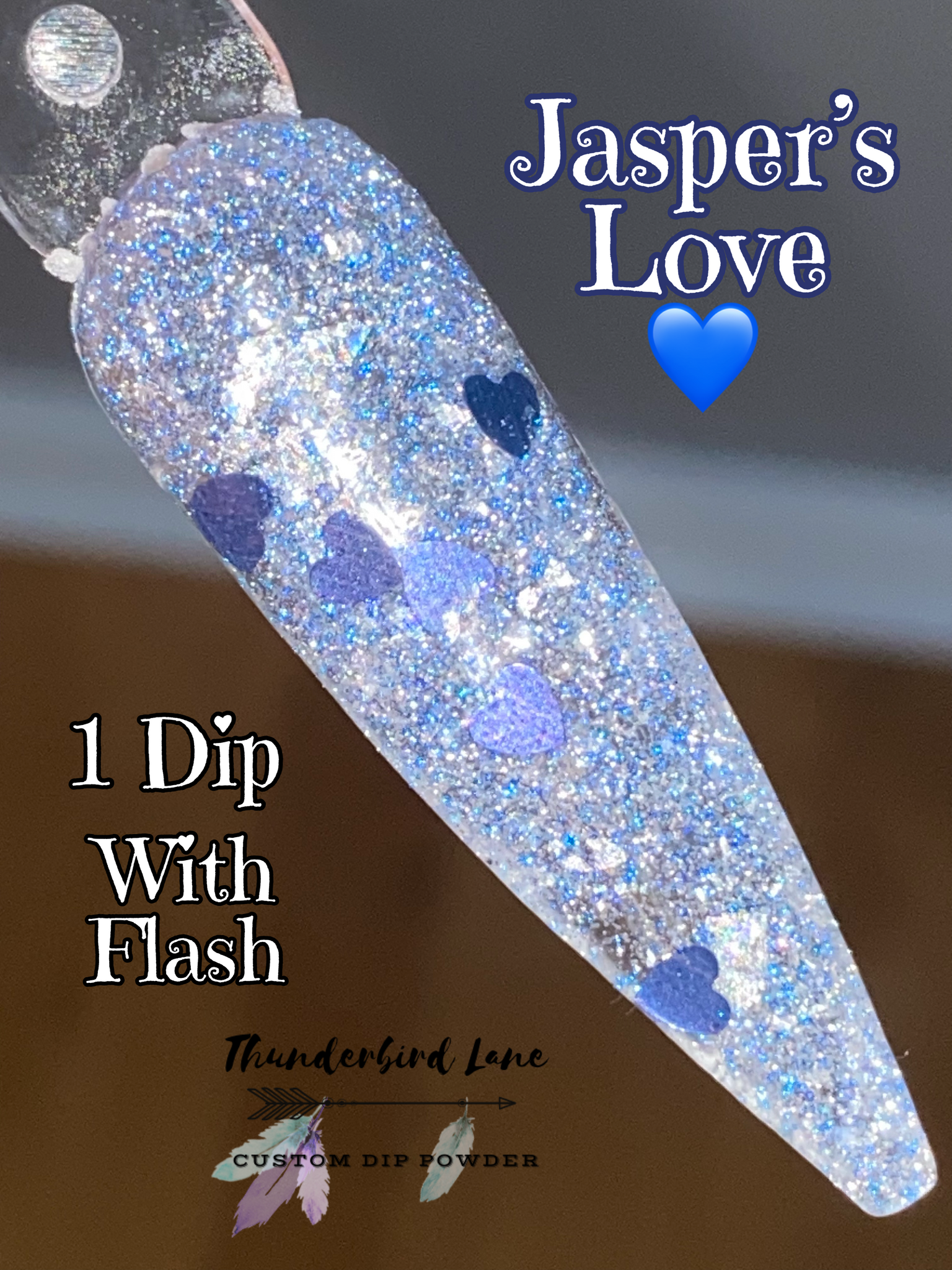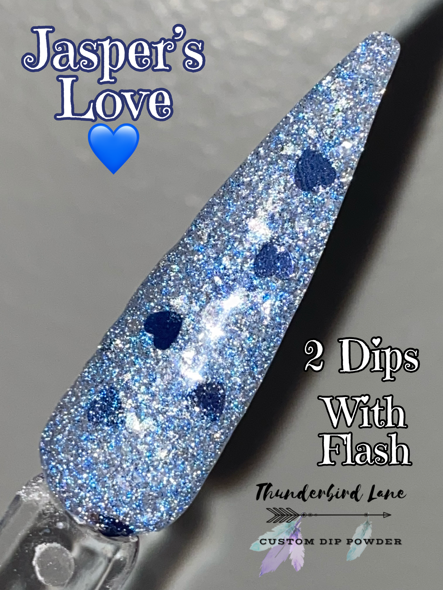 Jasper's Love is a custom color. The base is loaded with silver and blue ultra-fine reflective glitter mixed with silver holographic and crystal flakes along with a few extras. It's super sparkly in person and the camera has a hard time focusing on it, so it creates a lot of blurry pictures which makes it impossible to capture along with the overcast skies and no sun issue. Photos taken with flash as well to try to capture the reflective glitter.