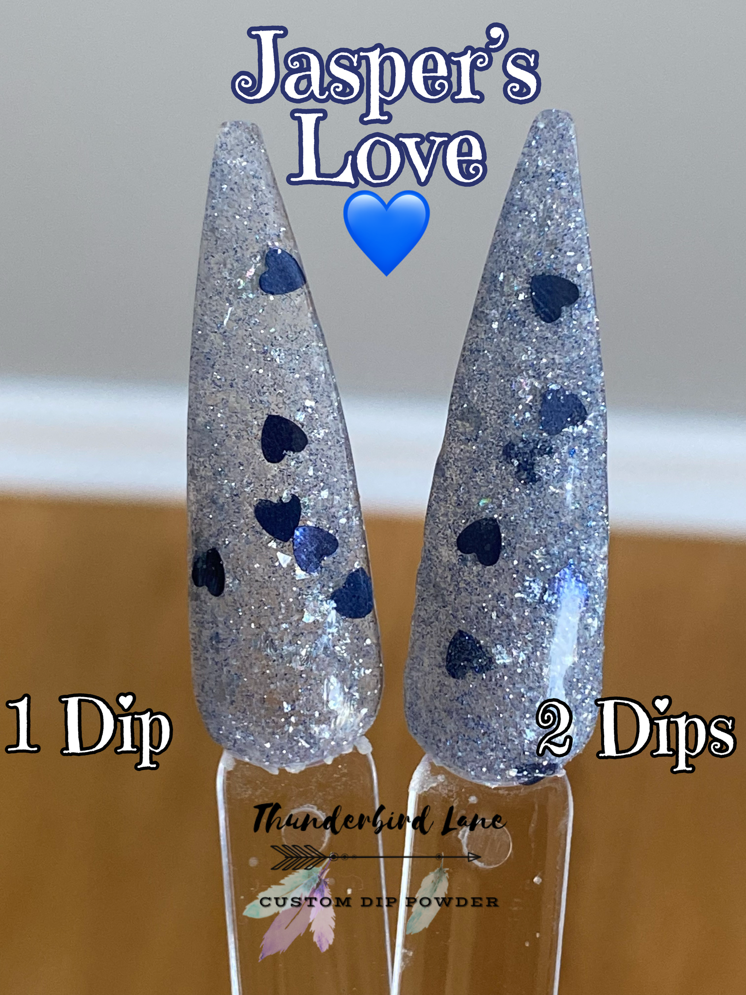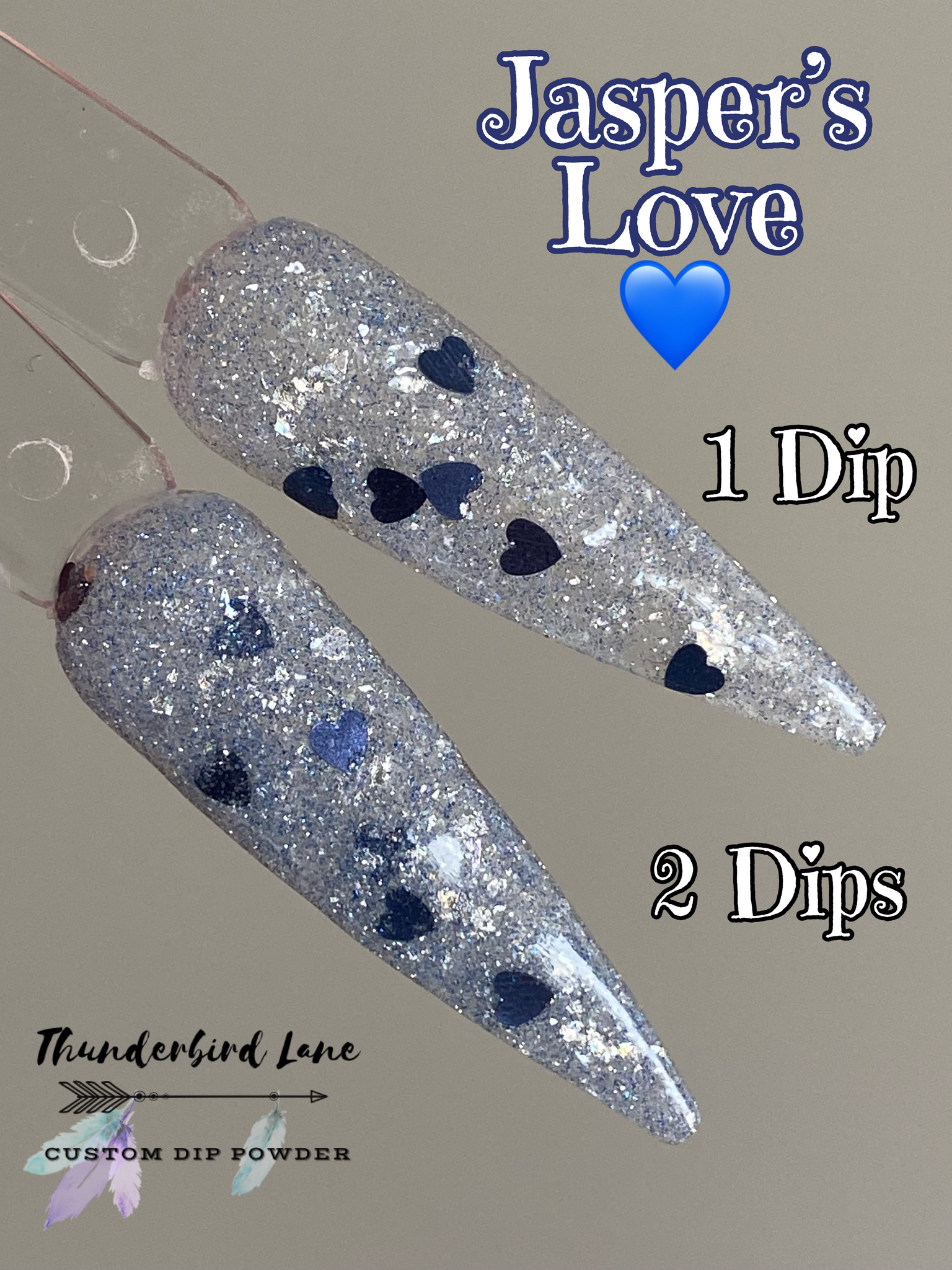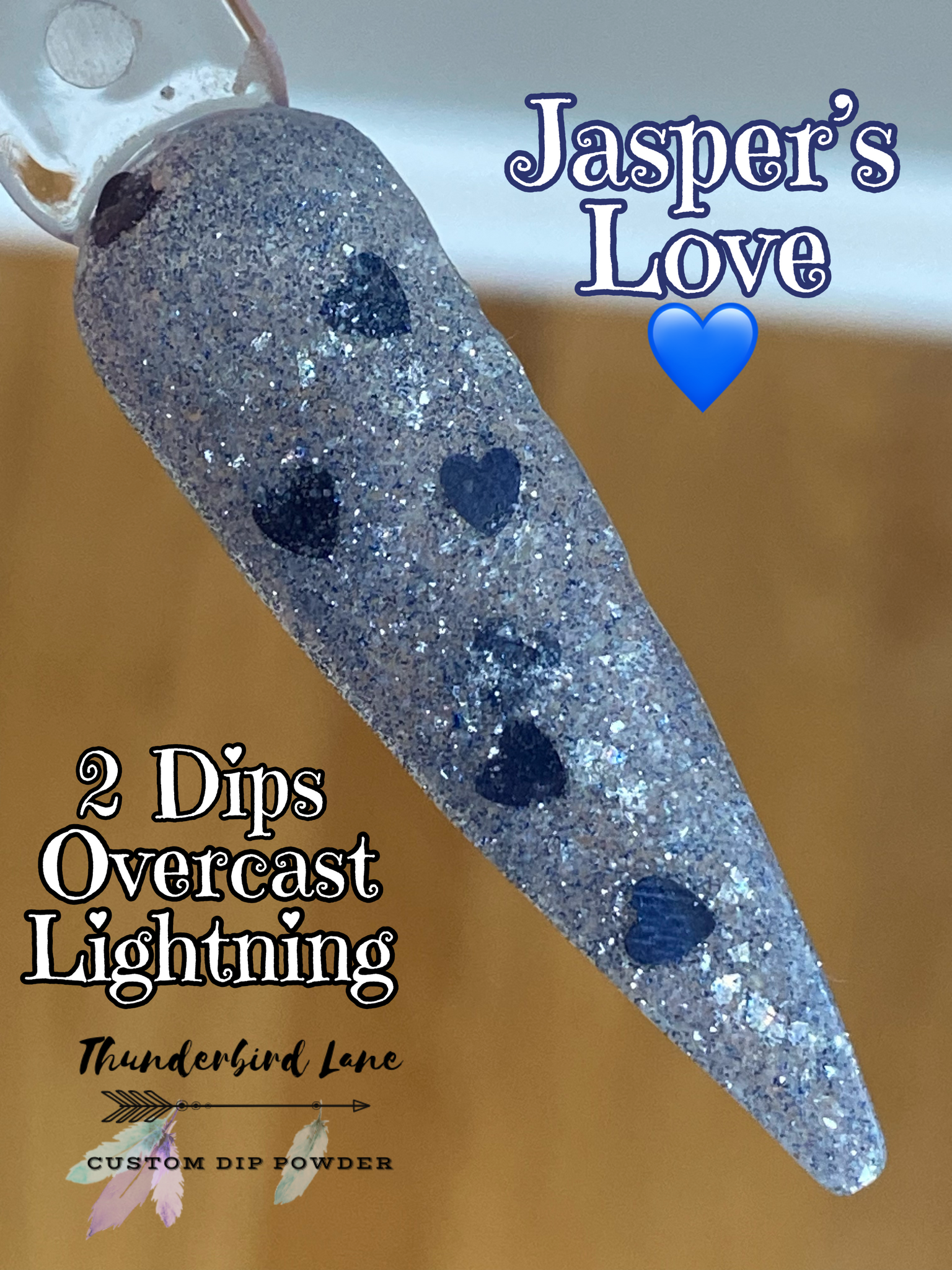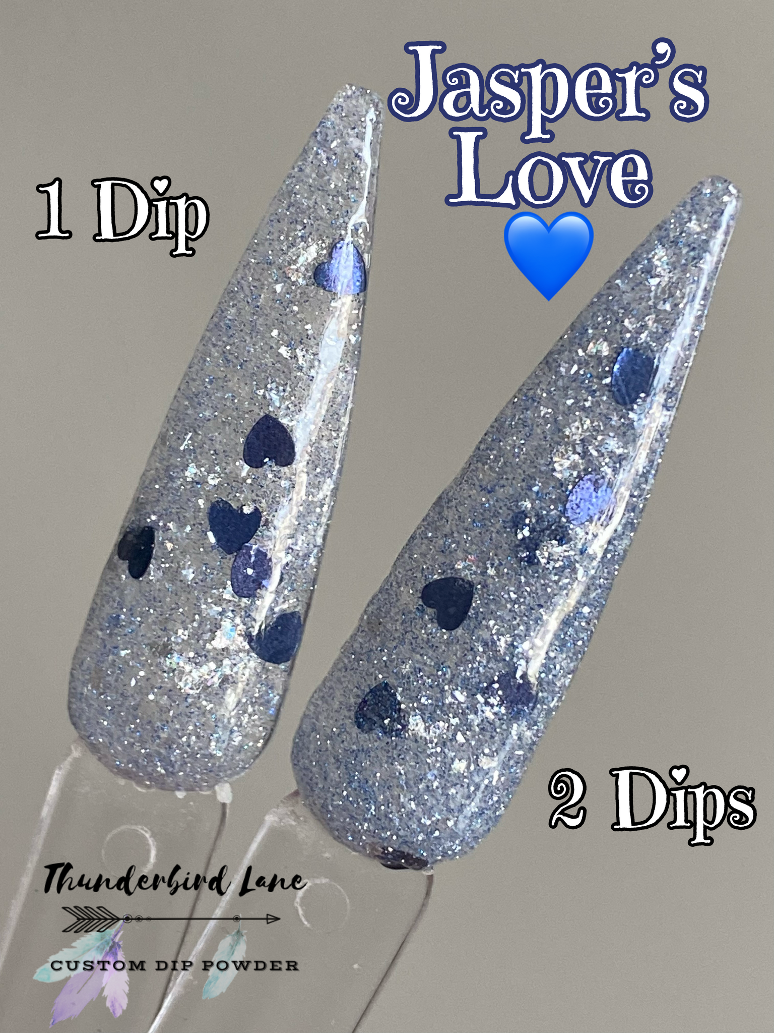 Jasper's Love is a custom color. The base is loaded with silver and blue ultra-fine reflective glitter mixed with silver holographic and crystal flakes along with a few extras. It's super sparkly in person and the camera has a hard time focusing on it, so it creates a lot of blurry pictures which makes it impossible to capture along with the overcast skies and no sun issue. Photos taken with flash as well to try to capture the reflective glitter.